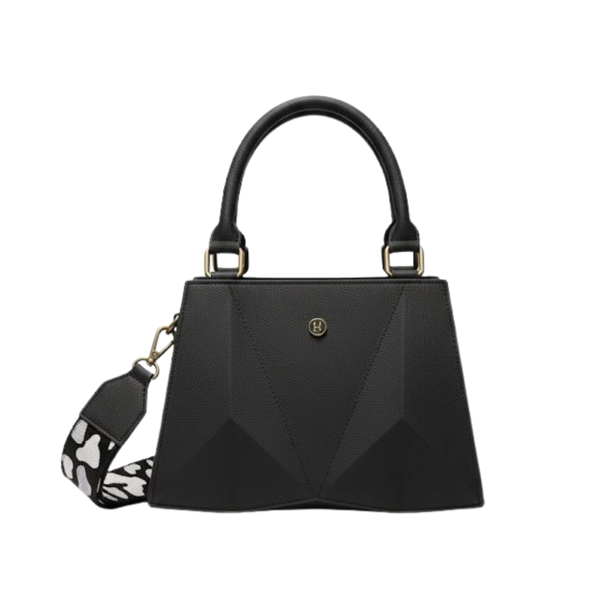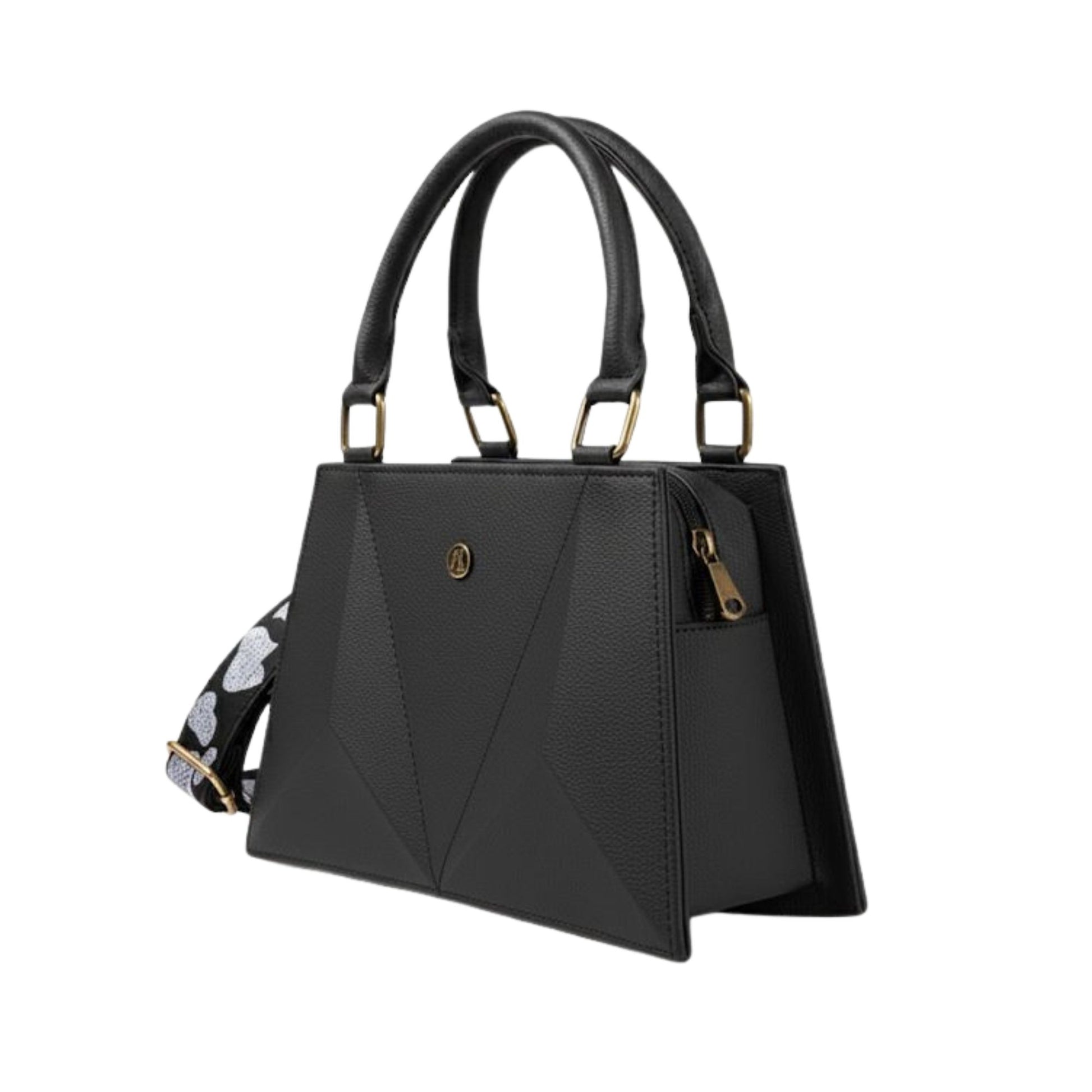 Los paneles geométricos contrastantes crean una composición visual que captura la esencia del diseño contemporáneo. Cada pliegue angular ha sido trabajado con precisión milimétrica por artesanos expertos en marroquinería bogotana, quienes entienden que la verdadera exclusividad está en los detalles que no se ven a simple vista.